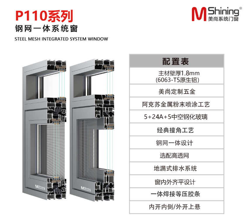 美尚P110系列钢网一体体系窗,是美尚体系门窗品牌凭仗多年的研发和出产经历,连系市场需要,推出的一款倾覆传统的门窗产物。这款门窗接纳了进步前辈的钢网一体手艺,将钢化玻璃与不锈钢网慎密连系,不只保证了门窗的宁静机能,并且统筹了雅观与适用。另外,它还能够知足双内开、外平开、外开下悬、外开隐纱等多种功效需要,为用户供给加倍便利、温馨的利用休会。美尚P110系列钢网一体体系窗,是您家居装修的抱负挑选,让您享用高品德的糊口。
